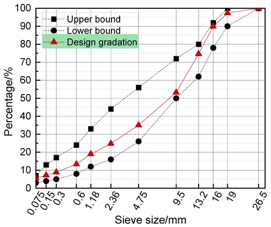 The materials used in this study included #70 matrix asphalt (virgin asphalt), virgin aggregate, and RAP. The performance indexes of #70 virgin asphalt according to the Chinese specification entitled Standard Test Methods of Bitumen and Bituminous Mixtures for Highway Engineering (JTG E20-2011) [24] are shown in Table 1. The virgin aggregate was limestone with a particle size of 0~20 mm, which was sieved according to the sieve size before being used in the preparation of recycled asphalt mixes. The performance indexes of virgin aggregate were tested following the Testing Methods of Aggregate for Highway Engineering (JTG E42-2005) [25], and Table 2 shows the results. In addition, RAP was obtained from the AC-20 middle surface layer of the Sanming section of the Fuzhou–Yinchuan Expressway in Fujian Province, China, and divided into three types (0~6 mm, 6~12 mm, 12~16 mm) through crushing and screening. The gradation, asphalt content, and performance indexes of RAP were obtained by following the Technical Specifications for Highway Asphalt Pavement Recycling (JTG T 5521-2019) [26] and are listed in Table 3 and Table 4. The performance indexes of all materials met the Technical Specifications for Construction of Highway Asphalt Pavements (JTG F40-2004) [27].