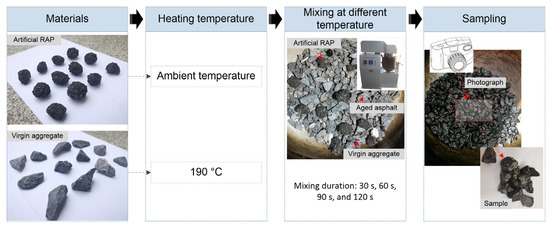During mixing, the aged asphalt on RAP surfaces adheres to the virgin aggregate and disperses. In addition, Yang et al. [5] found that the agglomerated particles present in RAP affect the dispersion of aged asphalt. Therefore, to better observe the dispersion of aged asphalt containing agglomerated RAP during the mixing process, an artificial RAP aggregate was produced using 12~16 mm RAP and 0~6 mm RAP asphalt mastic. The particle size of the virgin aggregate used in the test was 9.5~26.5 mm, and the amount of virgin aggregate was determined according to the proportion in the design gradation of RHMA, as shown in Figure 2. To observe the dispersion of reclaimed asphalt with different mixing durations, an asphalt mixture containing artificial RAP was produced at a mixing temperature of 175 °C over 30 s, 60 s, 90 s, and 120 s after the virgin aggregate had been heated by the oven at 190 °C for at least 2 h; the virgin asphalt was not added to the asphalt mixture during mixing. Finally, the distribution of aged asphalt on the surface of the virgin aggregate was photographed and observed for the different mixing durations, and the test process is shown in Figure 3.