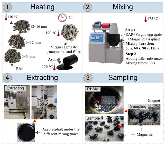 Magnetite was used as a probe aggregate to determine the blend of reclaimed asphalt with the different mixing durations and assess the blending of asphalt, and the blended asphalt was extracted from magnetite aggregate using trichloroethylene as a solvent with the centrifuge method and recovered from the solution with a rotary evaporator. In addition, the particle size of the magnetite used in this study was 16~26.5 mm, and it was used to replace a certain amount of the virgin aggregate in the RHMA. To investigate the blending of reclaimed asphalt and virgin asphalt with different mixing durations, RHMA containing 40% RAP and 60% virgin aggregate was designed, and the asphalt content of the RHMA was 4.4%. In accordance with the design grading (Figure 2), the mixing process for RHMA was designed as follows: (1) RAP was dried in the oven at 130 °C for no more than 2 h, and the virgin aggregate (including magnetite) and virgin asphalt were heated in the oven at 190 °C and 150 °C for at least 2 h; (2) the RAP, virgin aggregate, magnetite, and virgin asphalt were added to the mixer at 175 °C, and different mixing durations were used; (3) lastly, the filler was added to the mix at 175 °C for 30 s, and the RHMA was produced. Figure 4 illustrates the workflow which involved testing, sampling, and then testing again. Based on the above experiment, the blended asphalt containing reclaimed asphalt and virgin asphalt was recovered, and its performance and chemical composition could be tested.