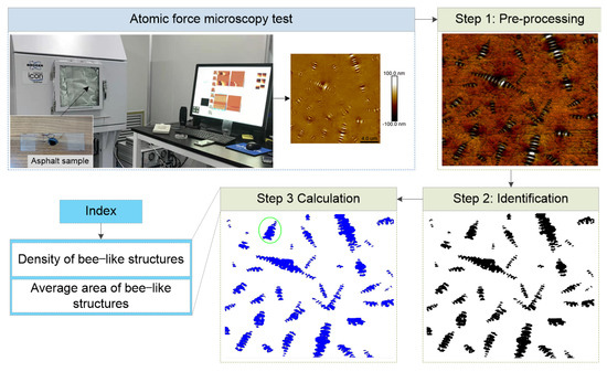 In previous studies, bee-like structures have been observed in asphalt AFM images, which were influenced by the composition of the saturate, aromatic, resin, and asphaltene (SARA) components). [37]. Therefore, to quantitatively represent the effect of asphalt blending using AFM images, the density and average area index of the bee-like structures were calculated with NanoScope Analysis software and computer-imaging analysis software and analyzed in two-dimensional images. Following our previous study [38], the image processing and the calculation process are shown in Figure 5.