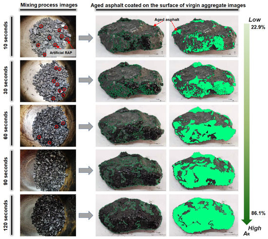 Dispersion of aged asphalt over the virgin aggregate surface with different mixing durations.