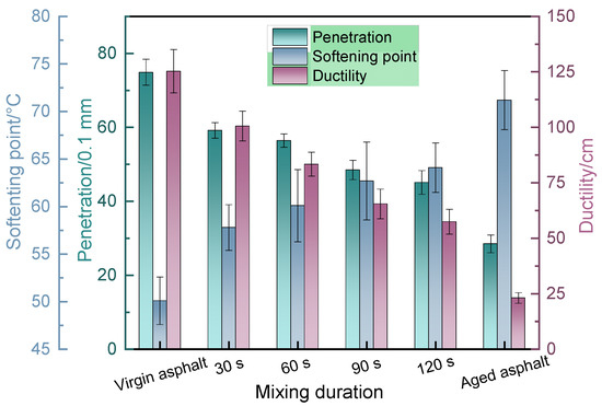 Figure 7 presents the test results for the physical properties of the asphalt binder with different mixing durations. It is evident that the virgin asphalt significantly improved the physical properties of the aged asphalt. In addition, the penetration and ductility of the blended asphalt decreased with the increase in mixing duration compared to the virgin asphalt, while the softening point showed the opposite trend. According to the aforementioned results, the mixing duration affected the degree of dispersion of the aged asphalt during mixing, resulting in the physical properties of the blended asphalt becoming close to those of aged asphalt. Furthermore, the physical properties of the blended asphalt exhibited a lower range of changes with the increase in the mixing duration, indicating that the properties of the blended asphalt were becoming stable.
