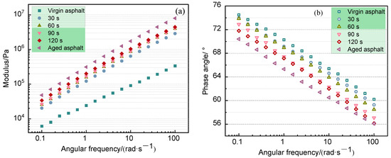 As can be seen from Figure 8a, the maximum and minimum complex moduli were represented by aged asphalt and virgin asphalt, respectively, and the complex modulus of the blended asphalt increased with the increase in the mixing duration compared to virgin asphalt, indicating that the blended asphalt was gradually aging, and the blended asphalt was more resistant to rutting and had better high-temperature stability. It can also be seen from Figure 8a that, on a log scale, the increase in the complex modulus of the blended asphalt was more significant at a mixing duration of 30 s compared to the virgin asphalt, and the rate of increase decreased with the increase in the mixing duration. Figure 8b shows that the phase angle of the blended asphalt decreased with the greater mixing duration compared to virgin asphalt. In addition, the reductions in the phase angle decreased with longer mixing durations, which was consistent with the variation law of the modulus.