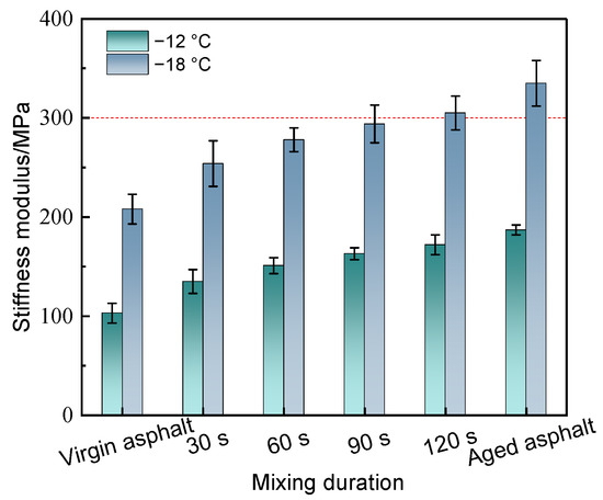 As the mixing duration increased, the stiffness modulus of the blended asphalt increased compared to the virgin asphalt (Figure 9). This indicates that the mixing duration resulted in the hardening of the blended asphalt and the low-temperature bending behavior weakened. In terms of the different mixing durations at different test temperatures, the growth range of the stiffness modulus decreased with increasing mixing durations. As the test temperature increased, the stiffness modulus S of the blended asphalt binder decreased, and the lower the temperature, the weaker the creep resistance of the asphalt was. The SHRP specify that the asphalt binder stiffness modulus should be lower than 300 MPa to ensure the low-temperature performance of an asphalt mixture. The mixtures of asphalt studied here had excellent properties at −12 °C and −18 °C, except for the asphalt binder recovered after 120 s of mixing.