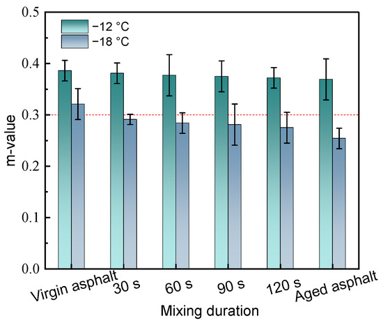 According to Figure 10, the asphalt binder was more prone to breaking under stress at lower temperatures. The results of the tests showed that the blended asphalt’s creep rate m decreased as the mixing duration increased and the asphalt’s degree of aging increased, resulting in the low-temperature crack resistance decreasing. However, when the mixing duration was increased, the range of decline of the creep rate m decreased. In addition, the SHRP suggest that the creep rate m should be higher than 0.3. Thus, the asphalt binder including virgin asphalt, aged asphalt, and blended asphalt met the requirements at −12 °C; however, the blended asphalt with various mixing durations did not meet the specifications at −18 °C.