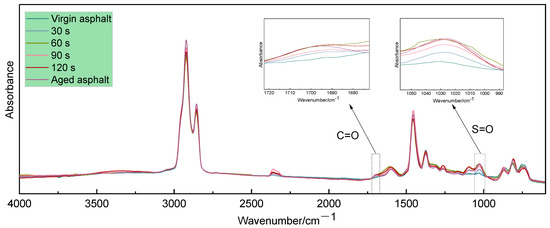 Figure 11 demonstrates the test results for the infrared spectra of the different asphalts obtained with FTIR. The vibration peaks at 748 cm−1, 811 cm−1, 873 cm−1, 1027 cm−1, 1375 cm−1, 1454 cm−1, 1602 cm−1, 1697 cm−1, 2354 cm−1, 2856 cm−1, and 2920 cm−1 are apparent. In addition, the number of vibrational peaks shows that no new functional groups were produced during the fusion of the old and new asphalt. Based on the trend in the vibrational peaks, it is clear that there was a significant difference between the C=O (absorption peak at the wavelength of 1697 cm−1) and S=O (absorption peak at the wavelength of 1027 cm−1) curves of the different asphalts, and the intensity of the absorption peaks increased with the increase in the mixing duration. The absorption peak of the aged asphalt was the highest, followed by those of the blended asphalt and virgin asphalt.