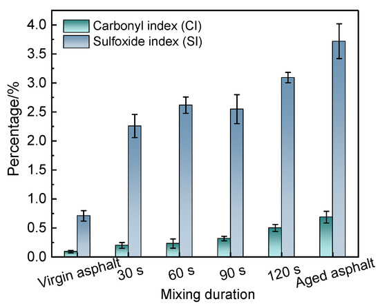 To evaluate the degree of blending of the asphalt binder containing aged and virgin asphalt in the FTIR test, the bond index ( and ) was calculated using Equations (2) and (3). Figure 12 shows that the carbonyl index and sulfoxide index were significantly increased after mixing at different times, with an increase of 116.4% and 218.3%, respectively, compared to the virgin asphalt. The carbonyl index and sulfoxide index in the virgin asphalt were the smallest, while the aged asphalt had the highest indexes. In addition, the range of increase of the carbonyl index and sulfoxide index in the blended asphalt decreased with the increase in the mixing duration.