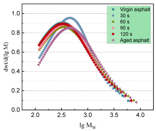 The GPC test was used to determine the molecular weight distribution for the asphalt binder. Previous studies have shown that the molecular weight of asphalt binder can be separated into three major fractions: large molecule size (LMS), medium molecule size (MMS), and small molecule size (SMS) [20]. Therefore, the change in the blending asphalt can be characterized by the molecular weight due to the difference in the molecular weight between reclaimed and virgin asphalt. A Waters 1515 gel permeation chromatograph was used to conduct the test and the chromatogram was obtained. According to the chromatogram, which was divided into 13 slices, the first 5 segments had LMS, segments 6–9 had MMS, and segments 10–13 had SMS. In addition, the LMS percentage was used to quantitatively evaluate the influence of the blending asphalt binder with different mixing durations, and the calculation is shown in Equation (4):