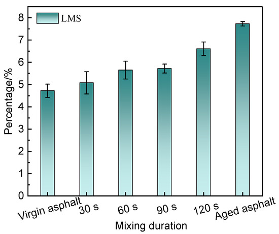 Figure 13 shows the relative molecular mass distributions for aged asphalt, blended asphalt, and virgin asphalt, with the horizontal axis representing the logarithm of the average heavy molecular weight (Mw) and the vertical axis representing the asphalt content (M). The higher the degree of aging of the asphalt was, the larger the area of the curve distribution for the larger scale of molecular weight was, as shown in Figure 13. As Figure 14 shows, the LMS content in the asphalt binder was calculated to quantitatively evaluate the change in the asphalt molecular weight during mixing. According to Figure 14, aged asphalt had the highest LMS content while virgin asphalt had the lowest. When the mixing duration increased, the LMS content in the blended asphalt increased, suggesting that the aging asphalt was more prevalent in the blended asphalt.