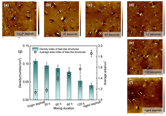 The AFM imaging technique was used in this study to capture the topography of the different blended asphalts and to analyze the degree of blending of the reclaimed and virgin asphalt with the different mixing durations. In this test, the surface topography was observed using a Bruker Icon atomic force microscope. The peak force, feedback gain, and probe scan rate were 30 nN, 20, and 1 Hz, respectively. To prepare samples, various asphalt binders were first heated, and a small amount of asphalt binder was put on a slide; next, the slide was heated in an oven at 110 °C for 2 min, and then stored at 25 °C ambient temperature and 25% relative humidity for another 24 h [36]. Finally, three parallel tests were carried out for each group and the microscopic image was recorded with a 20 μm × 20 μm scan size and a pixel resolution of 512 ppi × 512 ppi.