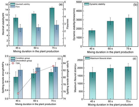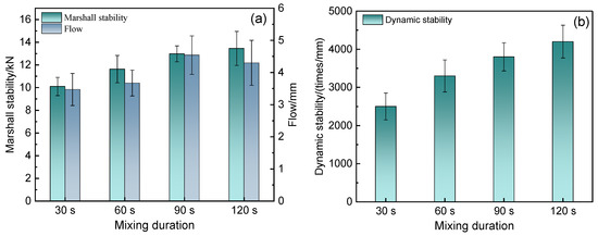Figure 16 shows the Marshall stability and flow for RHMA with different mixing durations. According to Figure 16a, the Marshall stability and flow of the RHMA were both affected by the mixing duration, the Marshall stability increasing with the increase in the mixing duration, while the growth trend for the flow decreased with the increase in the mixing duration. Figure 16b shows the rutting test results for RHMA with different mixing durations. As the mixing duration increased, RHMA’s dynamic stability increased, and its growth trend decreased with increasing mixing durations, which was consistent with the Marshall stability test results. All the RHMA samples also met the requirements of the JTG F40-2017 specification [27] in terms of the Marshall stability and flow.
