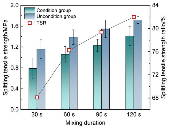 As shown in Figure 17, the splitting tensile strength and splitting tensile strength ratio for the RHMA varied before and after freeze–thawing. Figure 17 shows that the splitting tensile strength before and after the freeze–thaw cycle was affected by the mixing duration. With the increase in the mixing duration, the splitting tensile strength of both the conditioned and unconditioned groups of RHMA samples also increased. In addition, the splitting tensile strength ratio (TSR) for the RHMA increased with the increase in the mixing duration, and the growth trend for the TSR decreased with the increase in the mixing duration. The TSR should be greater than 70% for RHMA containing virgin asphalt according to the JTG F40-2017 specification [27]; therefore, the longer mixing duration was beneficial for RHMA to guarantee moisture stability.