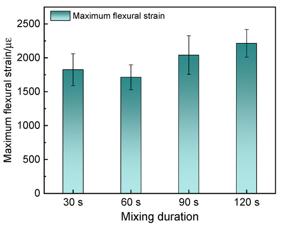 Figure 18 shows that, with an increase in the mixing duration from 30 s to 120 s, the maximum flexural strain of the RHMA increased accordingly. Therefore, the low-temperature crack resistance of the RHMA can be improved by increasing the mixing duration. In addition, the specifications of the JTG F40-2017 standard [27] require a maximum flexural strain not less than 2000 . As shown in Figure 18, the RHMA mixed over 30 s, 60 s, and 90 s did not meet the low-temperature performance requirements. Therefore, it is necessary to consider the low-temperature performance of RHMA during the design of the material composition and the mixing process.