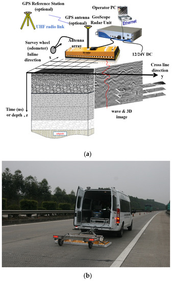 Three-dimensional(3D) ground penetrating radar (GPR) was used to detect the pavement layer thickness and slab length. The radar was produced by KONTUR, the radar host was GEOSCOPE MK IV, and the ground-coupled antenna was type DXG1820 with a frequency bandwidth of 200–3000 MHz. GPR was used to find physical defects, such as voids, broken slabs, uneven settlement of subgrades, etc. Measurements were taken continuously at speeds ranging from 20 km/h to 30 km/h. Trigger spacing, time window and dwell time were set separately at 2.5 cm, 25 ns and 3 us, respectively. The survey width was no more than 1.5 m, with each lane assessed three times for full-width inspection [33]. Approximately 15 km was inspected separately for each of the sections S118-TP, S118-HO and XL. The principle and components of GPR are shown in Figure 1a. Inspection using GPR is shown in Figure 1b.