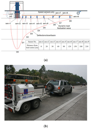 Inspection of pavement deflection basin: (a) technical principle of FWD; (b) FWD inspection.