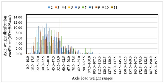 The two-way annual average daily traffic volume of 2-axle and 6-wheel and above vehicles (), the proportion of vehicles in two driving directions () and the proportion of vehicles in each lane in each direction () are shown in Table 3. The proportion of 2–11 types of vehicles () is shown in Table 4 and the proportion of vehicles with each axle type in each type of vehicle (ratio of and ) is shown in Table 5. The proportion of vehicles in different axle load weight ranges in each axle-type vehicle (ratio of and ) is the axle weight distribution coefficient. The axle weight distribution coefficient of single-axle single-tire of class 2–11 vehicles of S118 TP is shown in Figure 3.