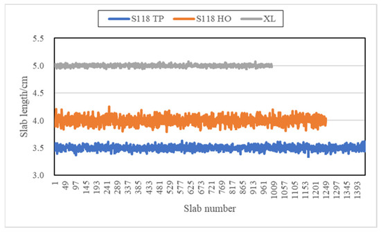 Slab length distribution of the design lanes of S118 TP, S118 HO, and XL.
