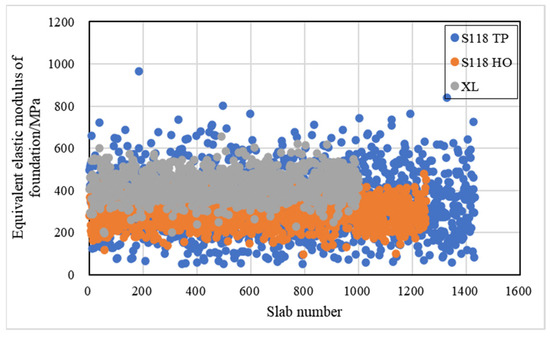 The equivalent elastic moduli for the foundation distributions of the design lane of S118 TP, S118 HO and XL are shown in Figure 8. The mean of XL was 423 MPa, which was the largest among the three sections and its coefficient of variation was about 15%, representing the smallest. The mean of S118 TP was relatively larger than that of S118 HO but it had the largest variability of about 41%. The bearing capacity of the structure underneath the concrete layer of XL was the highest and its uniformity was best, that of S118 HO was the lowest but its uniformity was better than the uniformity of S118 TP.
