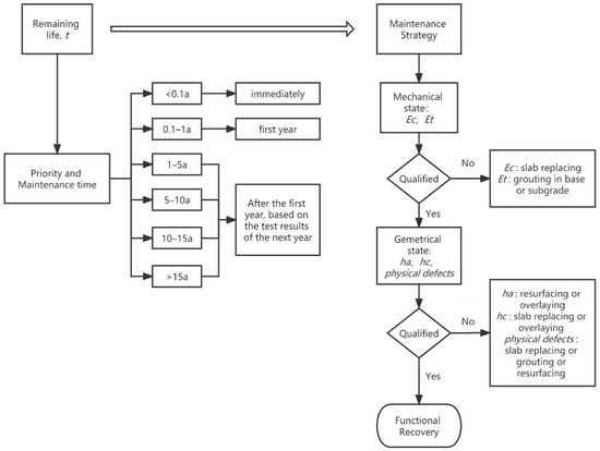 In general, the distribution of the remaining life and the corresponding technical condition of the pavement may be helpful for determining the maintenance strategy of the project. This is related to the reasonable arrangement of limited maintenance funds and the maintenance priority of different sub-sections. The shorter the remaining life, the higher the maintenance treatment priority. The maintenance plan for different sub-sections can be decided based on the detection results of GPR and FWD. The logic flow of the maintenance decision-making system is shown in Figure 11.