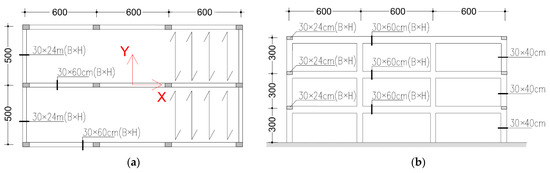 Geometry of the case study building. (a) Plan view; (b) Lateral view.