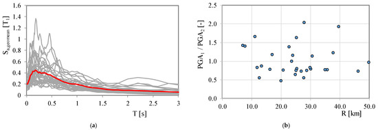Main characteristics of the adopted accelerograms. (a) Elastic acceleration response spectra; (b) PGA1/PGA2 Vs. R (distance to fault).