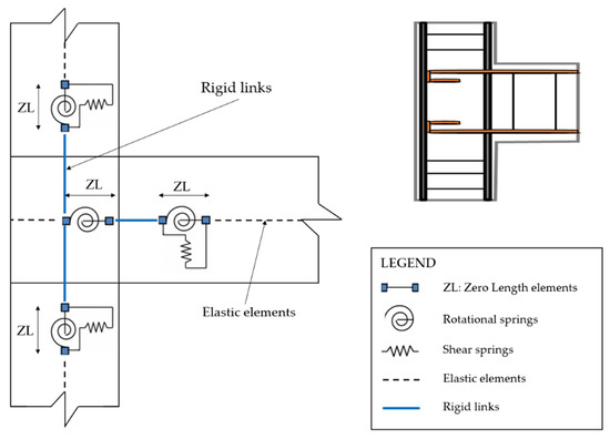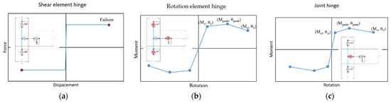 Non-linear behavior adopted in the FE models. (a) Zero-length elements at the extremities of beams and columns; (b) Plastic hinges at the extremities of beams and columns; (c) Zero-length elements simulating the non-linear behavior of the joint panels.