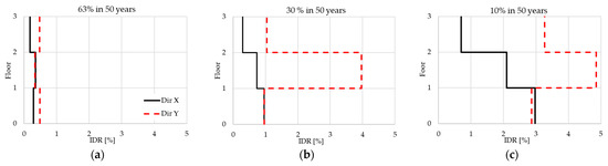 Median values of IDR for the time-history analyses at (a) 63%, (b) 30% and (c) 10% in 50 years of HLs (solid line X direction, dashed line Y direction).