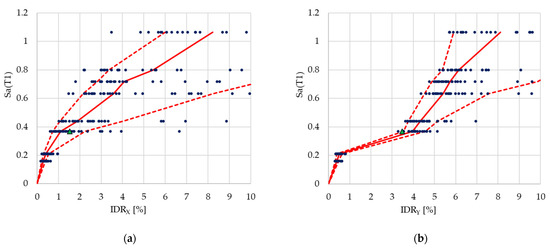 Figure 6 shows the structural analyses results in terms of IDA (Incremental Dynamic Analyses) curves representing the maximum IDR evaluated over the whole building vs the values of the geometric-mean spectra acceleration Sa (T1): reporting the trend of 50% (solid red line), 16%, and 84% percentiles (dashed red lines) for drift distribution and the results of the single time-history (blue circles).