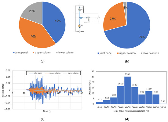 Deformability contribution of joint panel, upper column and lower column to the total rotation on an external node of the first floor during the first time-history analyses of the intensity level at 30% in 50 years HL. (a) Time-step corresponding to the attainment of the maximum interstorey drift ratio (instant 22.23 s of the time history); (b) Time-step corresponding to the attainment of the maximum rotation at the investigated joint panel (instant 27.35 s of the time history); (c) Example of rotation recorded for the joint panel, upper column and lower column; (d) Histograms diagram showing the distribution of the percentage values of the joint panel contribution during the time-history analyses.