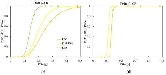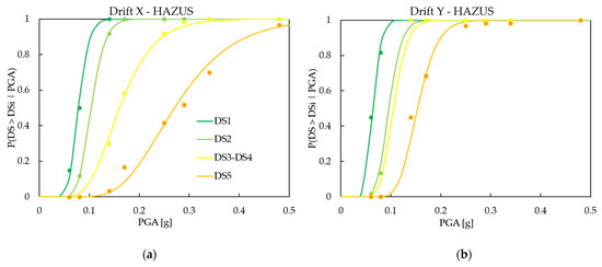 Figure 9 depicts the calibrated damage fragility curves for the X and Y directions, considering the damage thresholds according to HAZUS and CR criterion.