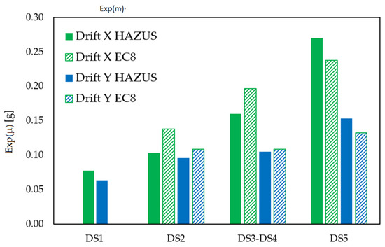 Median exp(μ) of fragility curves for X and Y direction and for the adopted IDR damage state thresholds.