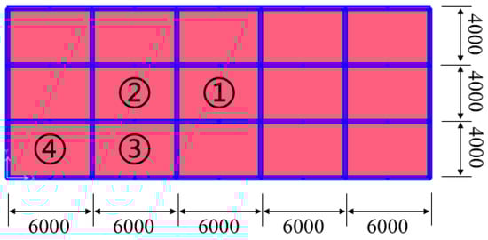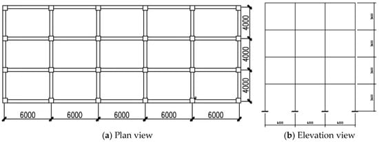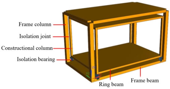 The numerical model was established using finite element analysis software SAP2000, and the original concrete frame structure model is shown in Figure 3. At the same time, a frame model using the novel partial seismic isolation system was established, in which the seismic isolation room was set in the middle of the second floor, and the rest of the structure was the same as the original structure. The basic layout of the building was as follows: there were five spans in the X-direction with a span of 6 m and three spans in the Y-direction with a span of 4 m. The structure had four floors and the height of each floor was 3.6 m. The cross-sectional dimensions of the columns were 700 mm × 700 mm, the main beam was arranged in an X-direction with a cross-sectional dimension of 300 mm × 700 mm, and the secondary beam was arranged in a Y-direction with a cross-sectional dimension of 300 mm × 600 mm. The concrete compressive strength of the beams and columns was 30 MPa, and the yield strength of longitudinal ribs and stirrup were 335 MPa and 300 MPa respectively. The constant load of the floor was 3 kN/m2 and the live load was 2 kN/m2. The seismic precautionary intensity of the structure was magnitude 8, and the corresponding design basic acceleration of the ground motion was 0.2 g. The beam−column units in the frame structure were input according to the corresponding frame section and material properties, and the beam−column nodes were set as rigid junctions; the floor slab was input using shell units and by specifying the partition bindings to achieve the assumption of the infinite in-plane stiffness of the floor slab [34].