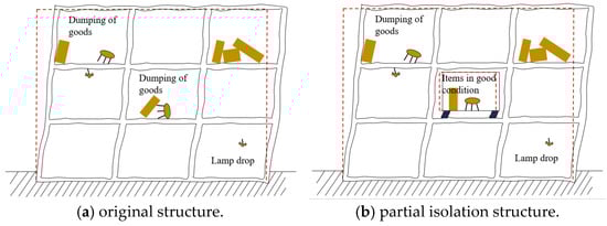 The partial seismic isolation system achieves a flexible connection in the horizontal direction between the original frame beam and the partial room through the seismic isolation bearing. The seismic energy transferred to the partial isolation room is significantly reduced and changes the dynamic characteristics of the room to approximate whole translation motion, thereby reducing the seismic response of the partial room [33]. This is because under the action of an earthquake, the bearing consumes energy because of the hysteretic behavior, so that the energy transmitted to the isolated room is significantly reduced, thus leaving it in a whole translation motion. As shown in Figure 2, this study analyzes the performance and effect of the partial seismic isolation system by comparing the seismic response of the original structure and the partial isolation structure.