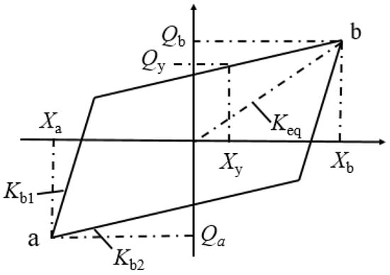 The nonlinear hysteresis curve of the LRB isolation lead core rubber support could be simplified to the bilinear model shown in Figure 4 [35]. In Figure 4, the pre-yield stiffness Kb1, post-yield stiffness Kb2, and equivalent horizontal shear stiffness Keq of the seismic isolation bearing were calculated as follows.