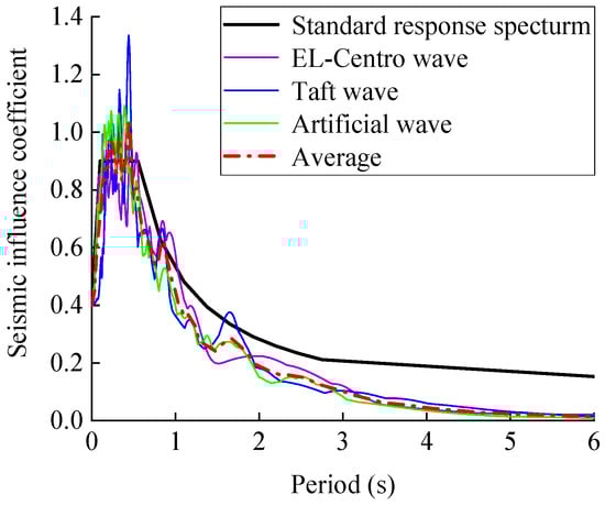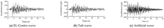 Considering the site category, fortification intensity, and seismic wave selection principle of the model, the EL-Centro wave, Taft wave, and one artificial wave were selected. Selecting the appropriate peak ground acceleration (PGA) of seismic waves is a key step in structural seismic response analysis [36,37]. The seismic waves were taken as the horizontal bidirectional input, and the X-direction peak acceleration was adjusted to 400 gal (the magnitude 8 rare earthquake level in Chinses code [38]). The peak acceleration curves of the input were adjusted according to the ratio of X:Y = 1:0.85 [38], respectively. The adjusted X-direction acceleration time history of the seismic wave is shown in Figure 5. The comparison of the seismic response spectrum and standard response spectrum is shown in Figure 6. The empirical response spectrum of the seismic record is consistent with the statistical significance of the normative response spectrum, so the selected seismic wave time curve met the selection requirements.