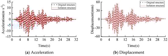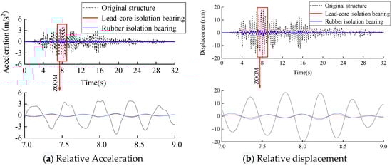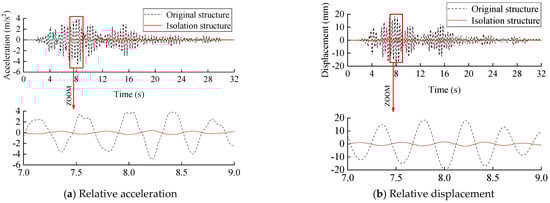 Figure 7 gives the relative acceleration and displacement time histories of the partial isolation room for the two structural systems under magnitude 8 rare earthquakes, i.e., the relative acceleration and relative displacement between the top and bottom of the columns of the isolated room. As shown in the figure, the seismic response of the room with a new partial isolation structural system is significantly smaller than that of the original structure. The maximum values of the relative acceleration before and after seismic isolation were 4.98 m/s2 and 0.46 m/s2, respectively, and the maximum values of relative displacement were 19.93 mm and 2.07 mm, respectively, which were calculated from Equation (4). The seismic isolation system changed the dynamic characteristics of the isolated room through the seismic isolation bearing. The isolated room showed the whole translation motion, and its seismic response was effectively reduced.