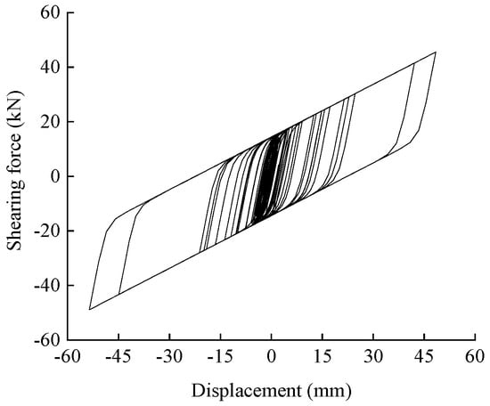 The choice of seismic isolation bearing has an important influence on the seismic isolation effect. Figure 8 shows the hysteresis curve of the seismic isolation bearing. Under the effect of a magnitude 8 rare earthquake, the maximum horizontal displacement of the bearing was 53 mm. The bearing compressive stress was 1.27 MPa, which was much less than the specification requirement. At the same time, the hysteresis ring of the bearing was full, indicating that the partial seismic isolation system had a good hysteresis energy dissipation performance.