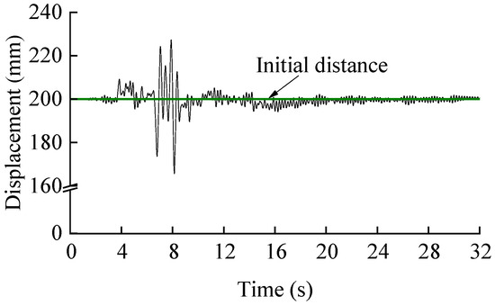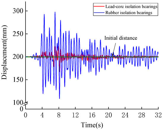 Figure 13 shows the time history curves of the distance between the column of the seismically isolated room and the adjacent column for both types of bearing, with an initial distance of 200 mm, i.e., the width of the reserved seismic isolation joints. The results show that the minimum distance between the partial isolation room and the adjacent members was 167 mm for the lead-core rubber bearing and 108 mm for the natural rubber bearing, indicating that no collision occurred between the partial isolation room and the adjacent members under the action of either bearing, and that the partial isolation structure had a high safety reserve. Because of the greater stiffness of the lead-core rubber isolation bearing, the displacement of the partial isolation structure could be better controlled than with the rubber isolation bearing.