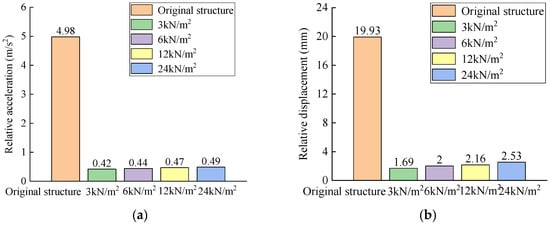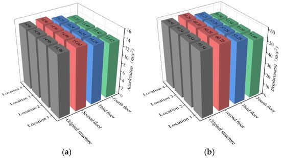 Figure 17 shows the peak relative acceleration and displacement of the partial isolation rooms for each model. The analysis and calculation results showed that the relative acceleration damping rates of the isolated rooms located on the second, third, and fourth floors were 90%, 87%, and 83%, respectively, and the relative displacement damping rates were 89%, 85%, and 75%, respectively. It can be seen that as the location of the isolated room moved to the upper floors, the damping effect of the isolated room decreased, but was still much less than the seismic response of the corresponding room of the original structure. Meanwhile, as shown in Figure 16, the in−plane variation in the location of the vibration isolated rooms had no significant effect on their damping effect.