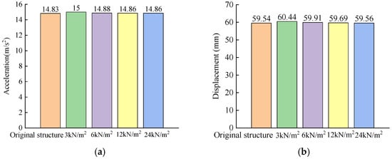 It can be seen in Figure 20, Figure 21 and Figure 22 that as the partial isolation room loads increased, the relative acceleration and displacement of the partial isolation rooms increased, but were much smaller than the original structural seismic response. There was no significant change in peak acceleration, displacement, inter-story displacement angle, and inter-story shear at the top of the structure. Therefore, it was considered that changing the mass and load of the partial isolation rooms had little effect on the seismic damping effect of the partial rooms and the overall seismic response of the house, and could be ignored. At the same time, when the floor load of the partial isolation room was 24 kN/m2, the deformation of the bearing and the shear and bending moment of the beam under the bearing were still within the safe range.