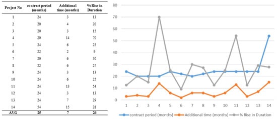 For the 37 case study projects, a significant positive correlation that was established between project cost and two causes of delay, including variations and error in design, which has been identified previously as being critical [,], and delay in progress payment [,], indicating a general level of agreement between the study and literature. A statistically significant positive relationship was also found between additional time and variations and error in design. This kind of association has not been previously explored in the literature. In quantifying the magnitude of delays, using duration variance, the schedule performance index (SPI) metric showed an average 43% increase in duration for the MOH hospital projects, with an SPI value of 0.71. The SPI value for the MOE and MOMRA projects was found to be 0.80 and 0.82, with an average increase in project duration being 27% and 23%, respectively. There were no precedence studies in literature to compare these values with, but they provide a reasonable insight into the magnitude of delays. These delays have a cost consequence, as suggested by the cost performance index (CPI), calculated as 0.84 (MOH), 0.92 (MOE) and 0.89 (MOMRA).