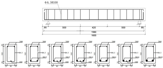 All test beams had the same dimensions (120 mm × 200 mm of cross-section and 1.6 m of length). The reinforcement ratios for the seven RASCC and four NC beams were 0.25%, 1.12%, 1.32%, 1.72%, 2.02%, 2.27%, and 2.82% and 0.25%, 1.32%, 1.72%, and 2.27%, respectively. Among them, 0.25% and 2.27%, respectively, were the minimum and maximum reinforcement ratios calculated following the code [29]. The beams’ longitudinal reinforcement was formed of HRB400-grade bars with diameters of 8 mm, 12 mm, 14 mm, 16mm, and 18 mm, respectively, depending on the reinforcement ratio. The yield strength (fy) of the longitudinal bar corresponded to 440, 492, 462, 434, and 420 Mpa, respectively. The ultimate strength (fu) corresponded to 620, 678, 594, 624, and 599 Mpa, respectively. The elastic modulus (Es) corresponded to 228, 202, 205, 208, and 198 Gpa, respectively. In addition, HPB300-grade reinforcement with a diameter of 6.5 mm was used to prepare stirrups. Additionally, the design parameters and reinforcement of the test beams are shown in Table 4 and Figure 2, respectively.