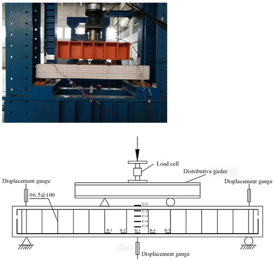 The test was carried out on a 500 kN hydraulic servo testing machine at the structural laboratory of the Shenyang University of Technology using a four-point bending loading method. A 500 kN compression load cell was fixed at the actuator to measure the load value; a YDH-100 displacement gauge was set at the girder span and at the two end supports to measure the span deflection of the test beam. Five strain gauges (R-1, R-2, R-3, R-4, and R-5) were attached at equal intervals within the purely bending section of a longitudinal bar in the test beam to measure the strain variation in the longitudinal bar. In addition, five strain gauges (C-1, C-2, C-3, C-4, and C-5) were attached to the span section of one side of the beam to measure the strain variation in the concrete along the height of the span section (Figure 3). Limewash was applied to the other side of the beam, and a grid was drawn with ink lines to observe the initiation and development of cracks. Subsequently, crack widths and heights were measured for all loading levels. In addition, loads, displacements, and strains were recorded by the imc CRONOScompact-400-RACK system.