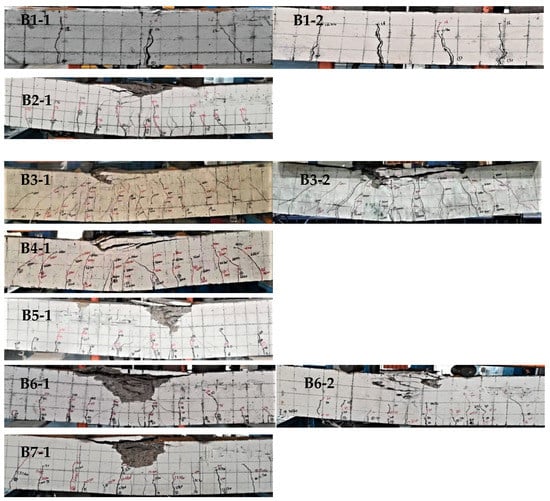 Figure 4 shows the failure form of RASCC beams under different reinforcement ratios. The failure form of these beams changed considerably with an increase in the reinforcement ratio. For example, once the concrete in the tensile zone of the RASCC beam B1-1 cracked at a reinforcement ratio of 0.25%, the tensile longitudinal bars yielded. At this point, the reinforcement strain reached 2680 με, while the concrete in the compressive zone remained uncrushed, resulting in typical under-reinforced beam failure. In this case, only a few cracks were observed within the purely bending section of the beam, and their lengths were similar to the beam length. Furthermore, the width of the main crack was significantly greater than those of the other cracks, which was consistent with the failure form of NC beam B1-2. However, the cracks in B1-1 were significantly wider and fewer, suggesting that the crack development in the RASCC under-reinforced beam was less adequate than that in the NC beam.