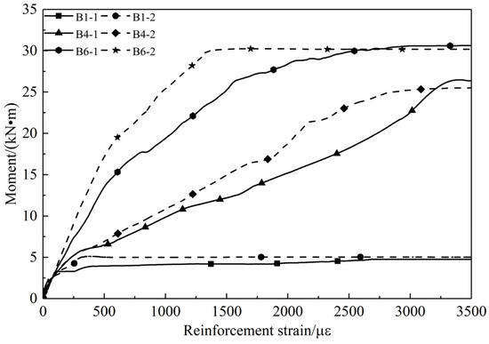Figure 6 illustrates the moment–strain curves for part of the RASCC and NC beams. The reinforcement strain curves for the under-reinforced beams B1-1 and B1-2 overlapped. Only after cracking, the B1-1 curve was slightly lower than the B1-2 curve due to the slightly lower cracking load in B1-1 than that in B1-2. The strain development before cracking and after yielding of the longitudinal bar was similar for both balanced-reinforced beams B4-1 and B4-2. However, during the working phase between cracking and yielding, the strain increase of the tensile reinforcement accelerated, whereas the strain curve remained linear with the bending moment, resulting in a significant difference in the reinforcement strain between B4-1 and B4-2 beams at this stage. Under the same reinforcement conditions, the reinforcement strain in B4-1 was greater than that in B4-2. It is assumed that the earlier cracking of the B4-1 beam resulted in an earlier start of stressing of the longitudinal bar at the crack, resulting in a higher value of reinforcement strain for B4-1 under the same bending moment. Additionally, the reinforcement strains of test beams B6-1 and B6-2 significantly differed in the working phase between cracking and yielding (the strain curve of B6-1 was higher than that of B6-2). Furthermore, under ultimate load, the reinforcement yielded when the reinforcement strain increased to 2485 με. However, at a B6-2 reinforcement strain of 1275 με, the longitudinal bars had not yet yielded. Therefore, during the working phase between cracking and yielding of the longitudinal bars, the strain in the tensile reinforcement was greater in the RASCC beams than that in the NC beams.