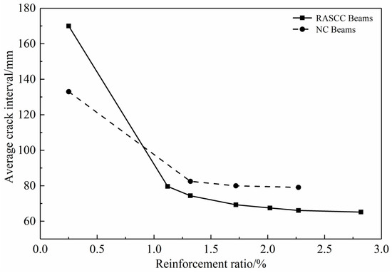 Figure 8 compares the average crack intervals for the different specimens. The average crack interval for both RASCC and NC beams gradually decreased with an increase in the reinforcement ratio of the longitudinal bars. As the reinforcement ratio was increased from 0.25% to 2.82%, the crack interval of the RASCC beams decreased by 62%. The increase in tensile longitudinal bar increased the ability of the reinforcement to restrain the concrete deformation, limiting the relative slip between the reinforcement and concrete, resulting in a reduction in the reinforcement stress transfer length and crack interval. Additionally, under the same reinforcement condition, the average crack interval of the RASCC beams was reduced by approximately 13% compared to the NC beams.
