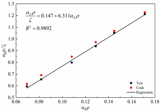 The test values of ζ of the RASCC beams were calculated from the measured data by Equation (6). With reference to the expression of ζ in the code regarding the transformed reinforcement ratio αEρ, the relational expression of ζ of the RASCC beams was obtained based on the test data (Figure 10).