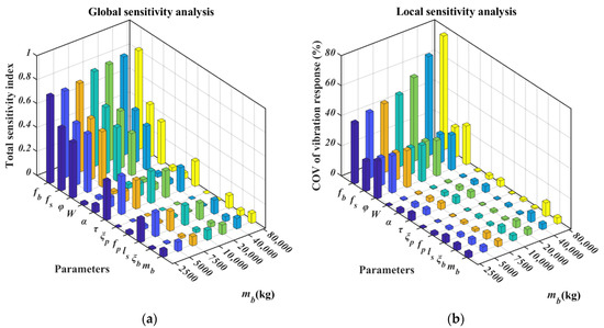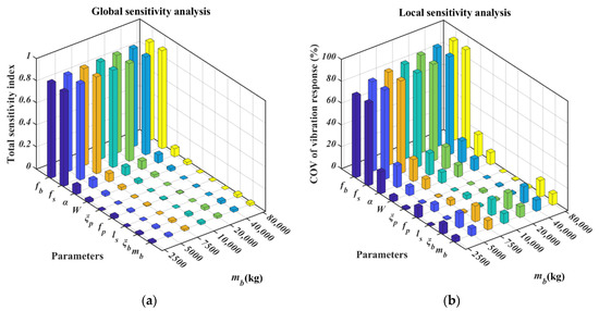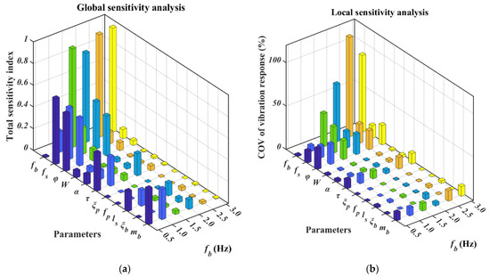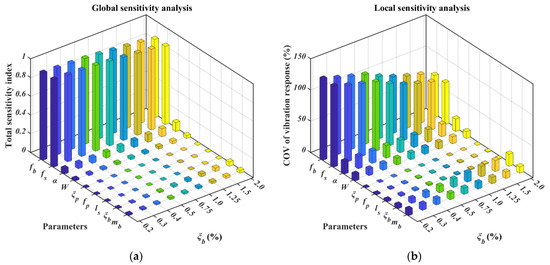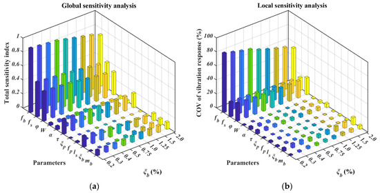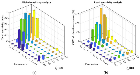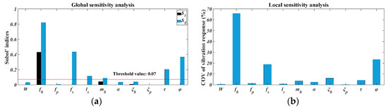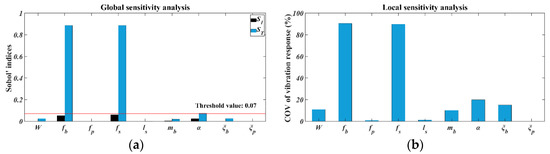 The results from GSA and LSA of the vibration response of a representative footbridge induced by a crowd: (a) the Sobol’ indices for system and load parameters; and (b) the COV of vibration response when one of the system and load parameters varies.