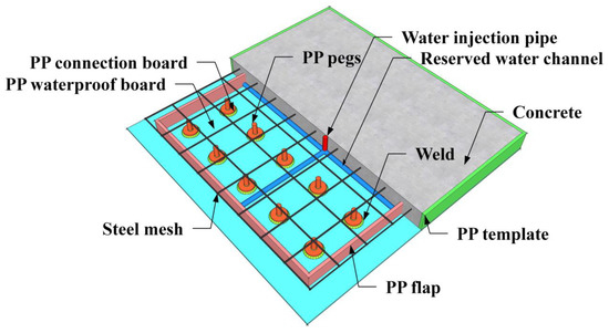 In addition, a waterproof plastic plate was included. The plastic template, waterproof plastic plate, and the PP waterproof plate were connected by welding. In order to allow water to flow into the specimen, the method of embedding reinforcement was used to reserve a water injection channel in the specimen. After the concrete was set, the embedded reinforcement was extracted, and the plastic plate and plastic template were blocked by planting reinforcement glue. The internal steel mesh of the specimen was arranged using HRB400 double-layer rebar of 8 mm diameter with 200 mm space. Four hooks with a diameter of 16 mm were embedded in the corners of the specimen. The thickness of the concrete protective layer was set to 40 mm, and the concrete strength was C40.