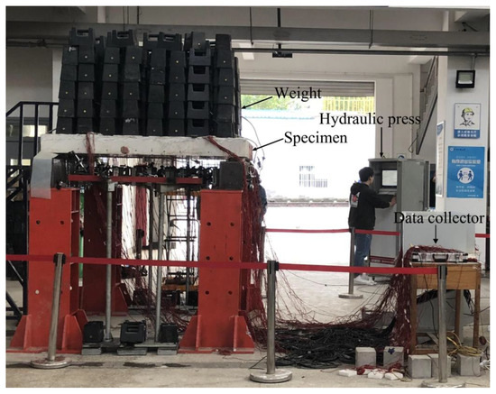 The specimen was placed on a supporting roller having a span of 1500 mm, and the center line of the roller was 150 mm from the edge of the specimen. A movable hinge support and fixed hinge support were each fixed on one side. The test loading was divided into two stages: uniform loading and water pressure loading. In the uniform loading stage, a cast iron weight was used for graded loading; the pressure was increased by 3.79 kN/m2, which was maintained for 15 min at each stage, and remained unchanged after sequential loading to 21.21 kN/m2. A hydrostatic water pressure press was used for water pressure loading, which was composed of a pressure pump, pressure control host, and computer control system.